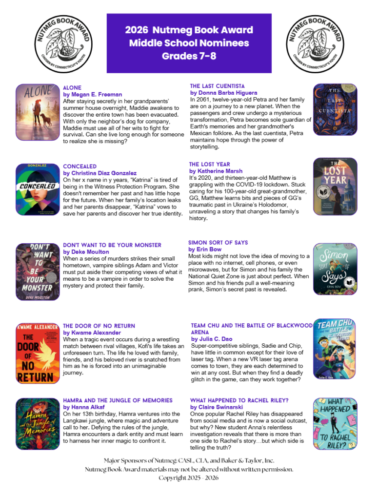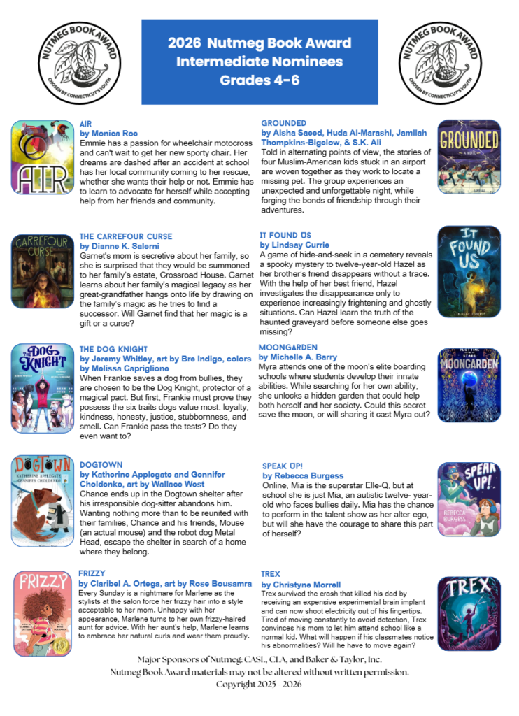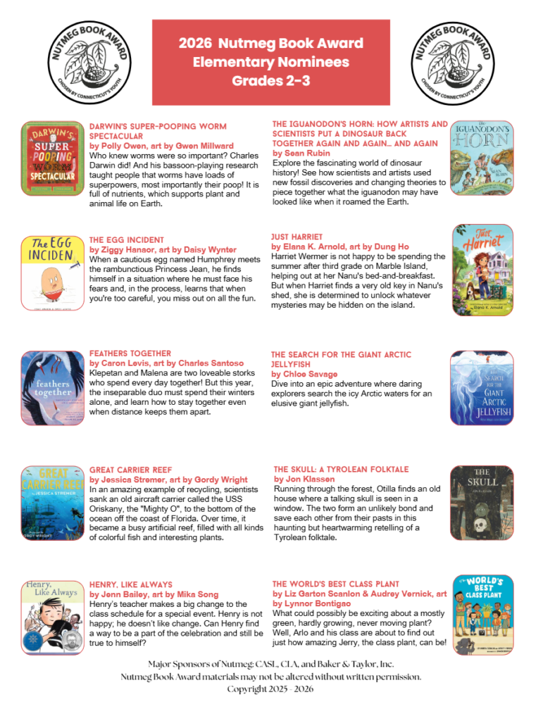 Find out more about Nutmeg books, hear from the authors, and learn interesting book-related facts when you listen to the Nutmeg Book Drops podcast! Librarians from across the State of Connecticut formed Librarians ConneCT and collaborated on a podcast about the 2023 and 2022 Nutmeg Book Award nominees. This podcast can be found on Spotify or wherever you find your favorite podcasts. More information can be found at Librarians ConneCT.