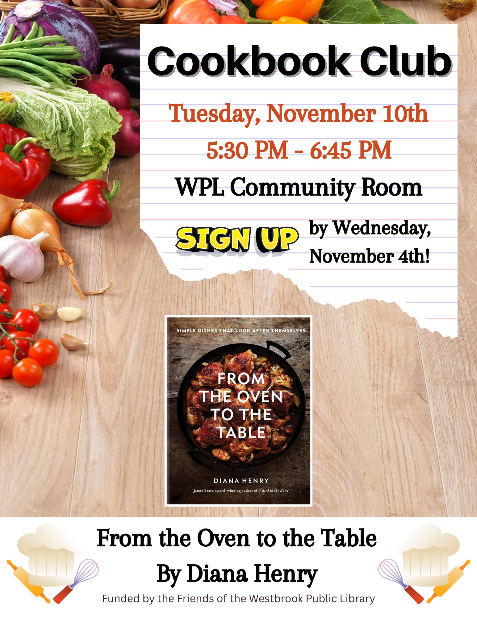 Enjoy eating yummy dishes and making friends? Then Cookbook Club is the place for you! Attendees check out a copy of the cookbook of the month from the library. Then, they bring a dish of their choosing from that cookbook after signing up to sample with others. *Bring your own serving utensils*