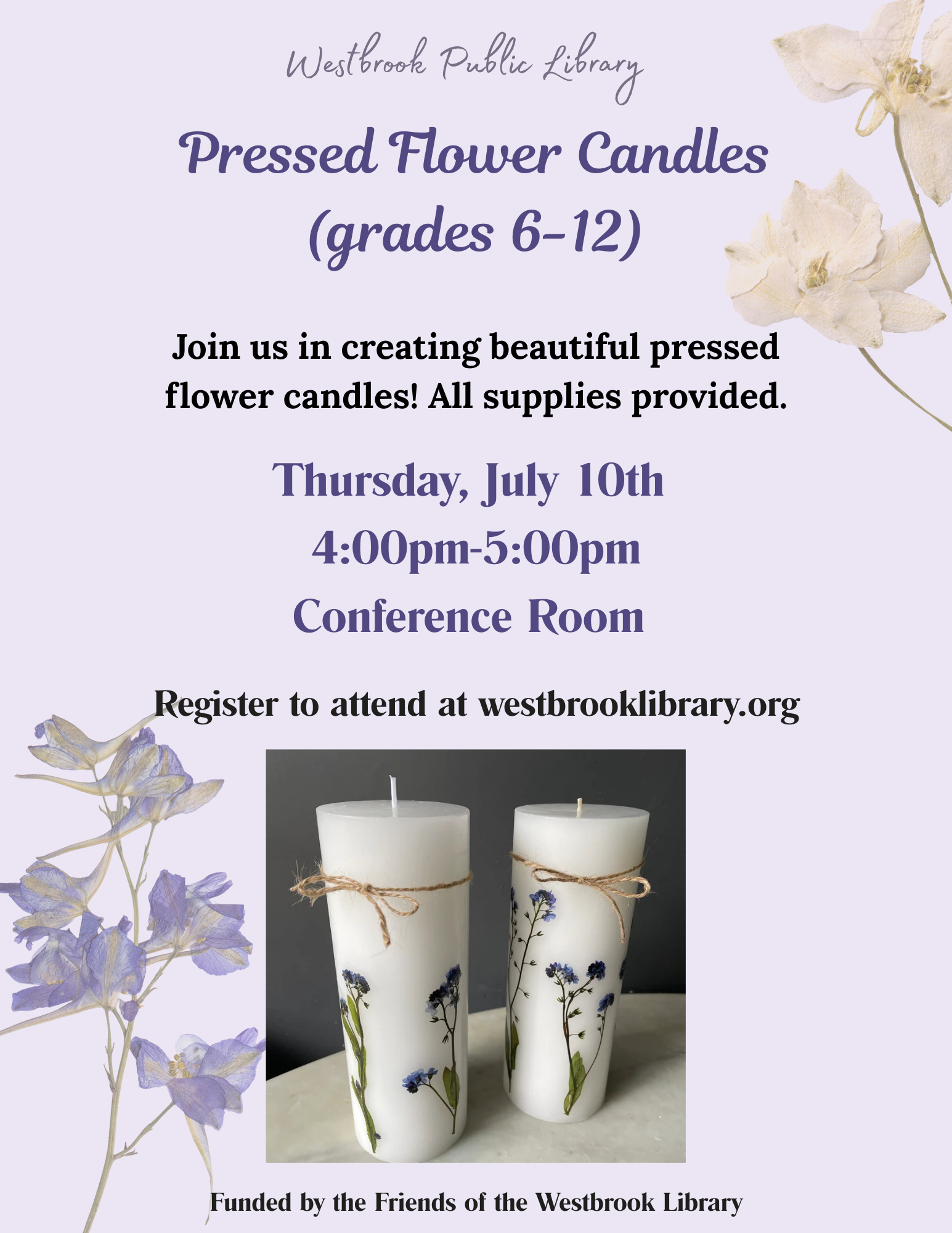 Join us on Thursday, July 10th from 4:00pm-5:00pm at the Westbrook Public Library to create pressed flower candles!