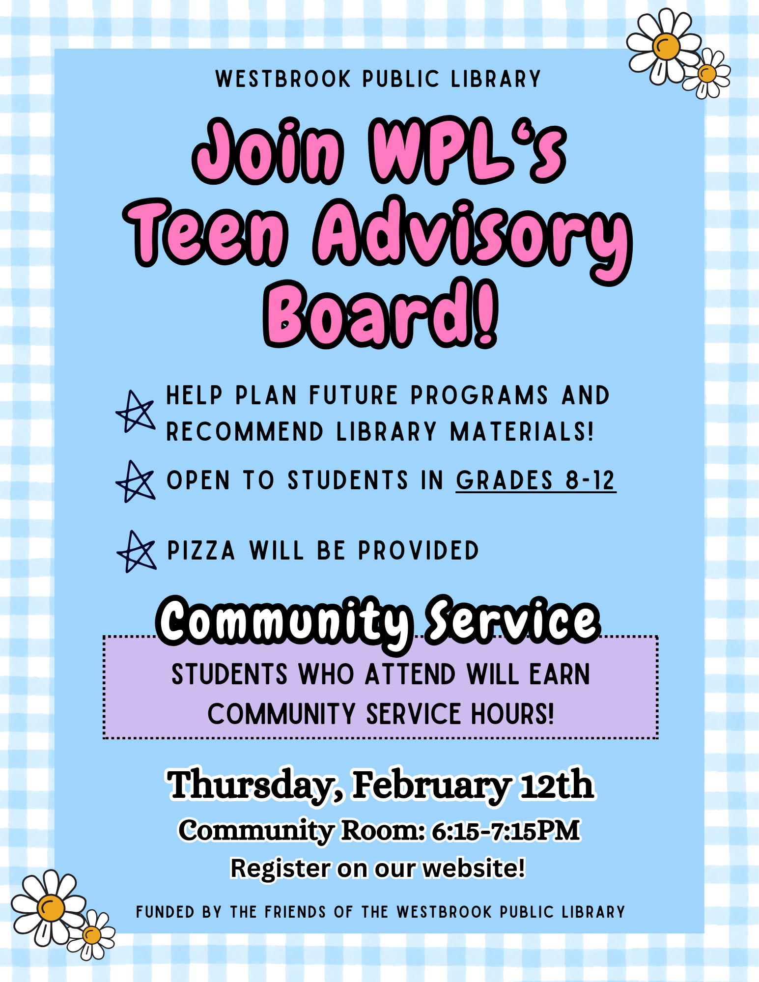 NEW date for February! We will meet on February 12th instead of February 5th. Join the Teen Advisory Board!Are you a student in grades 8–12 who wants to make a difference at the library? Join our Teen Advisory Board (TAB)! As a TAB member, you’ll help plan library programs, create digital and print media, assist...