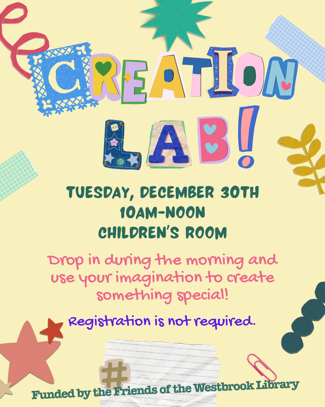 Join us Saturday, January 3rd from 10:00 AM – 11:00 AM at the Westbrook Public Library to celebrate the new year as we make create 2026 vision boards! Free pizza will be served. 15 out of 20 spots available. Register HERE! This program is for adults 18+. Location: Community Room on the lower level of the library. All...