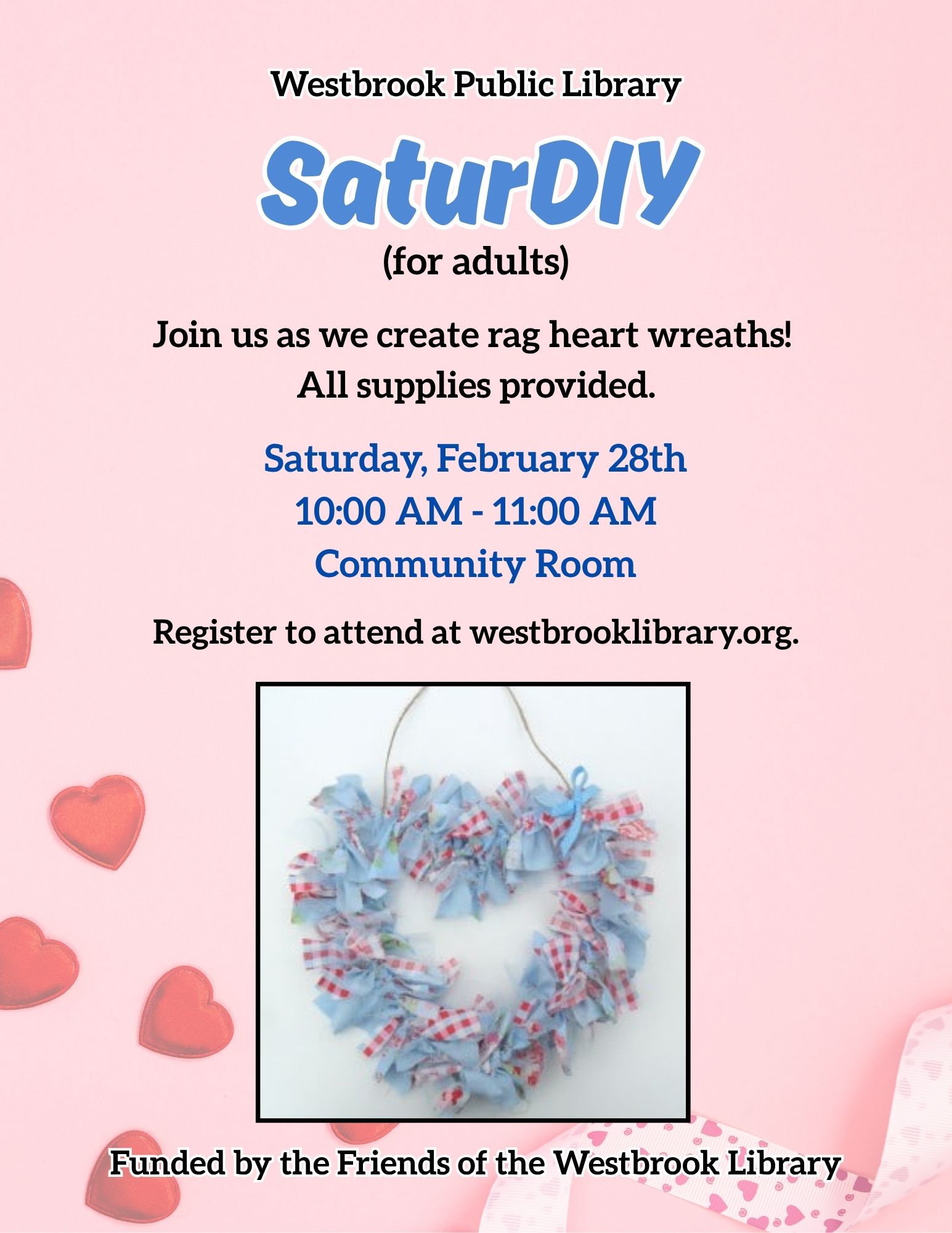 Join us Saturday, February 28th from 10:00 AM – 11:00 AM at the Westbrook Public Library as we turn fabric scraps into beautiful rag heart wreaths to add a pop of color and cozy vibes to your home! Registration opens January 28th! 15 out of 15 spots available! This program is for adults 18+. Limited space!...