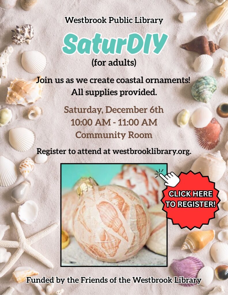 SaturDIY 2025 September: Fall Paper Flower Wreaths October: Pumpkin Spice Sugar Scrub November: Wooden Gnomes December: Coastal Ornaments 2026 January: February: March: April: May: June: July: August: September: October: November: December: